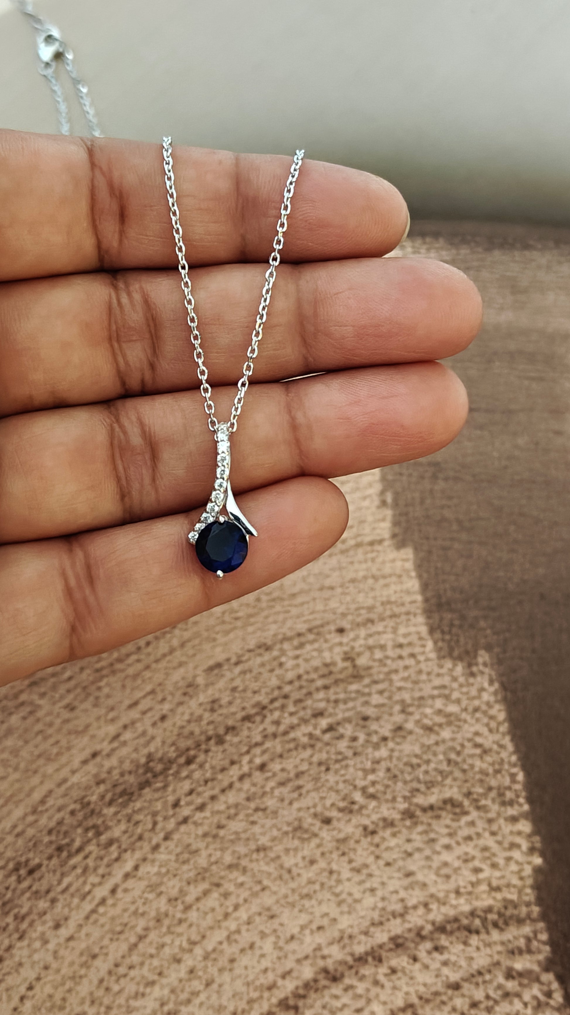 This stunning piece features a vibrant, deep blue oval-cut sapphire as its centrepiece, cradled in a graceful, flame-inspired setting of polished sterling silver. A delicate cascade of sparkling white accent stones—either diamonds or high-quality CZ stone the central sapphire, maximising its brilliance and adding a luxurious effect.