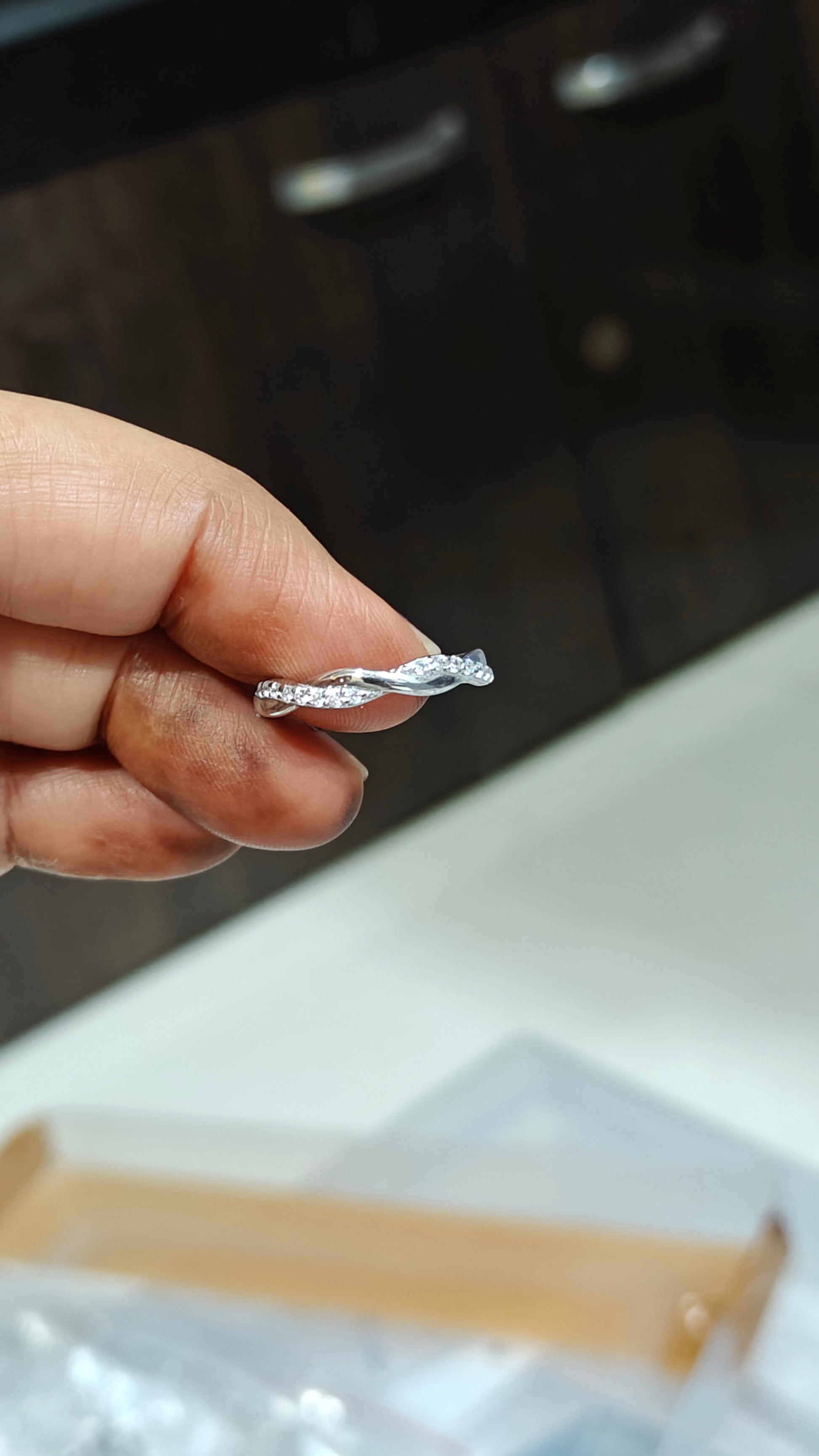 Elevate your everyday style or celebrate a special moment with our breathtaking Delicate Twists Silver Diamond Eternity Ring. Crafted in 925 Sterling Silver, this exquisite band features two delicate, intertwined strands, symbolising two lives forever connected in love and unity.This Design makes it perfect for stacking with an engagement ring, wearing as a contemporary wedding band, or as a subtle, sophisticated statement piece on its own.